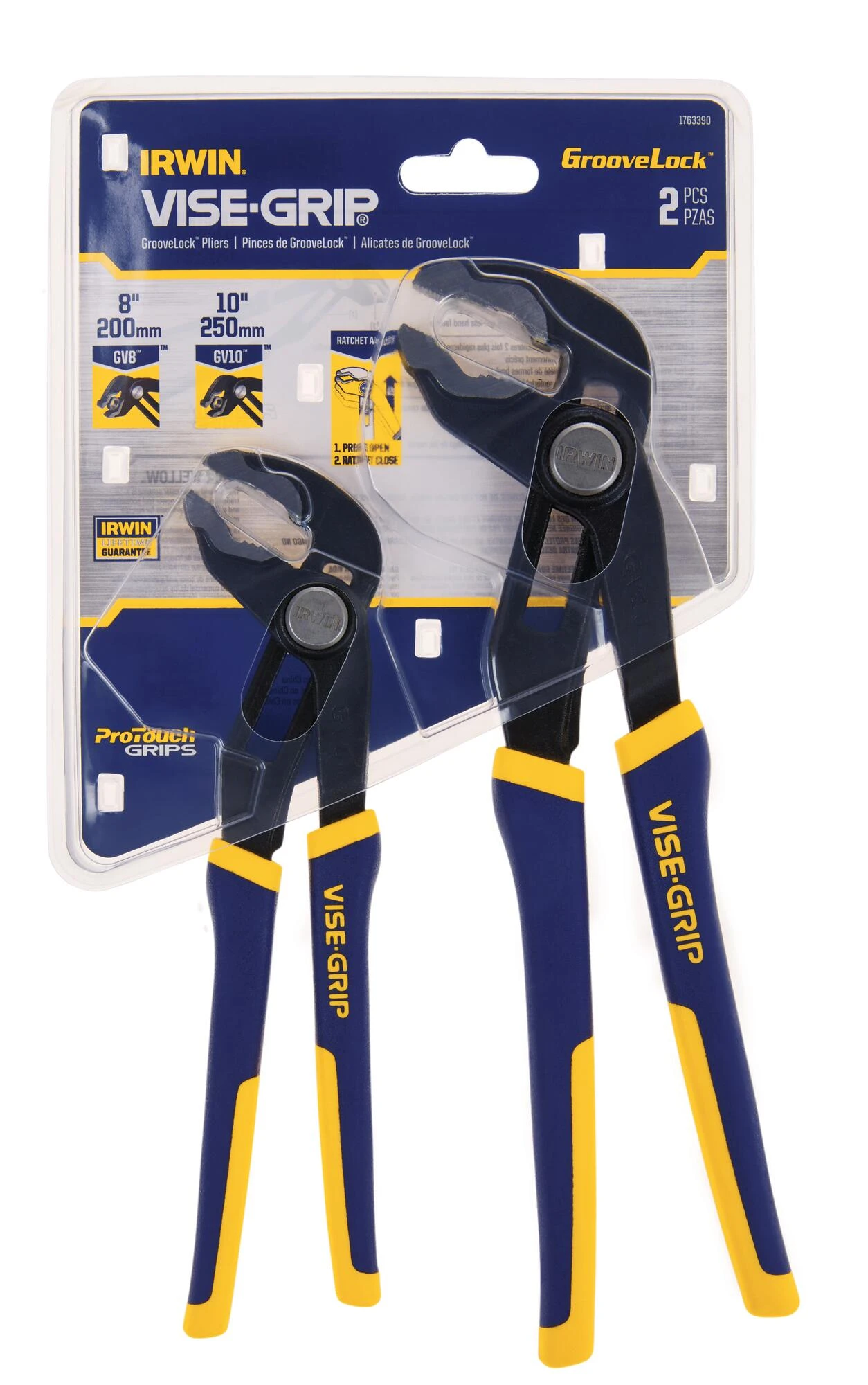 - Set contains one 8-in GrooveLock plier and one 10-in GrooveLock plier