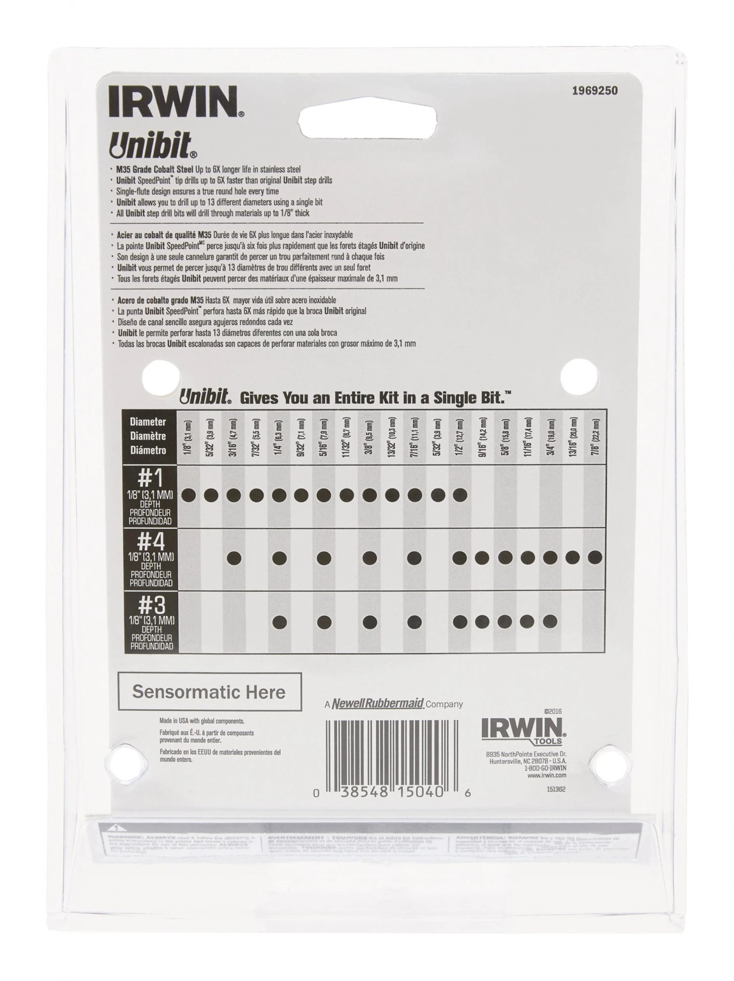 - Unibit #4 contains a 3/8-in hex shank and will drill 12 hole sizes- 3/16-7/8-in (1/16-in steps)